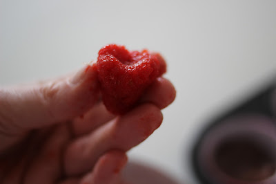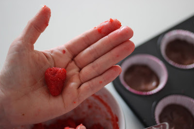 Jetzt wird die „Himbeere“ auf den ersten Löffel Teig gesetzt und leicht rein gedrückt.