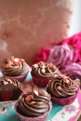 Die Schokoladenbuttercreme in einen Spritzbeutel geben und sie über den abgekühlten Muffin spritzen. Verziert habe ich den Cupcake noch mit ein paar Zuckerherzen.