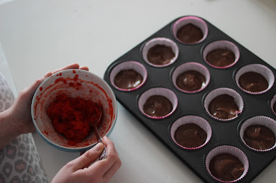 Der rote Teig kommt jetzt in 2 Muffinförmchen in den Ofen und wird 10 Min. gebacken.